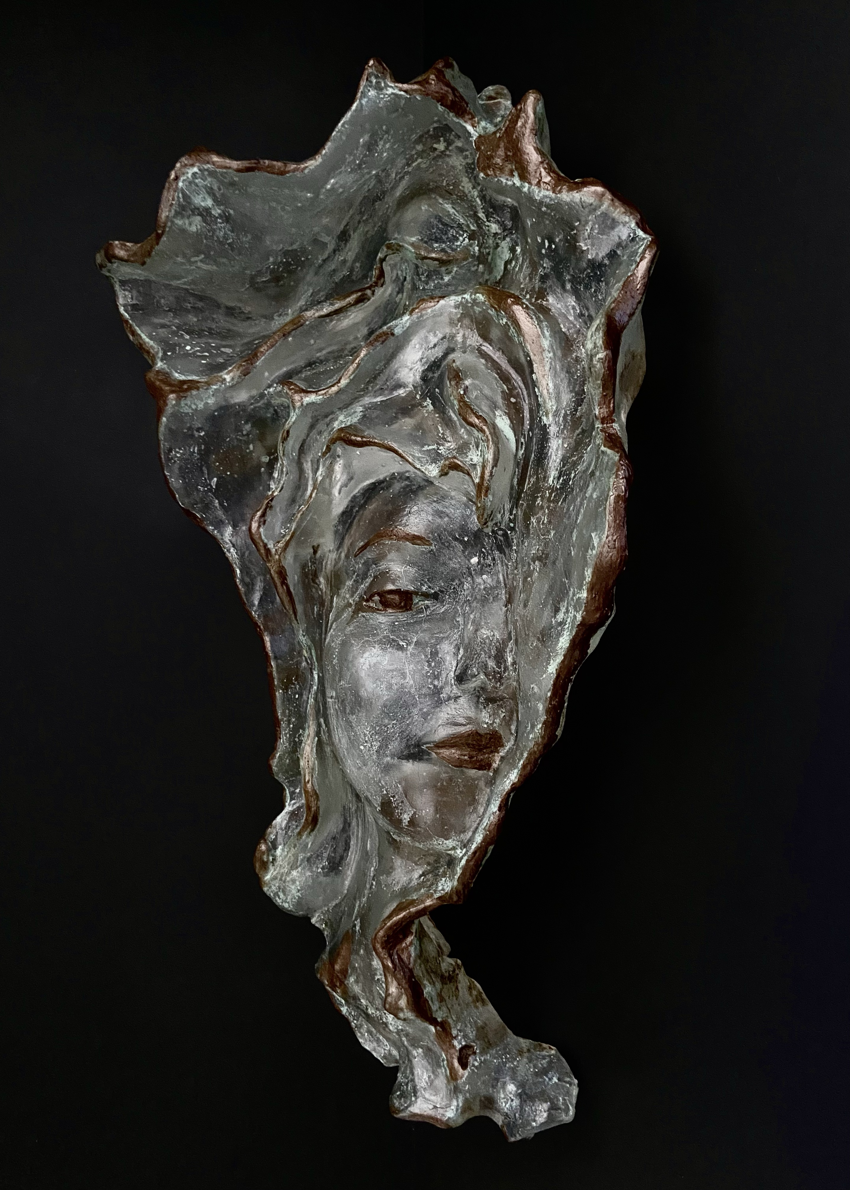 “Of the Ocean” came to life on July 6, 2007 in the Pilchuck Glass School Studio Building. Made using clear glass cullet and grey blue glass powders and decorated with copper enamel and patina. “Of the Ocean is a sculpture of a woman’s face in an oyster shell form and can be displayed lying down or hung on the wall using attached hardware.