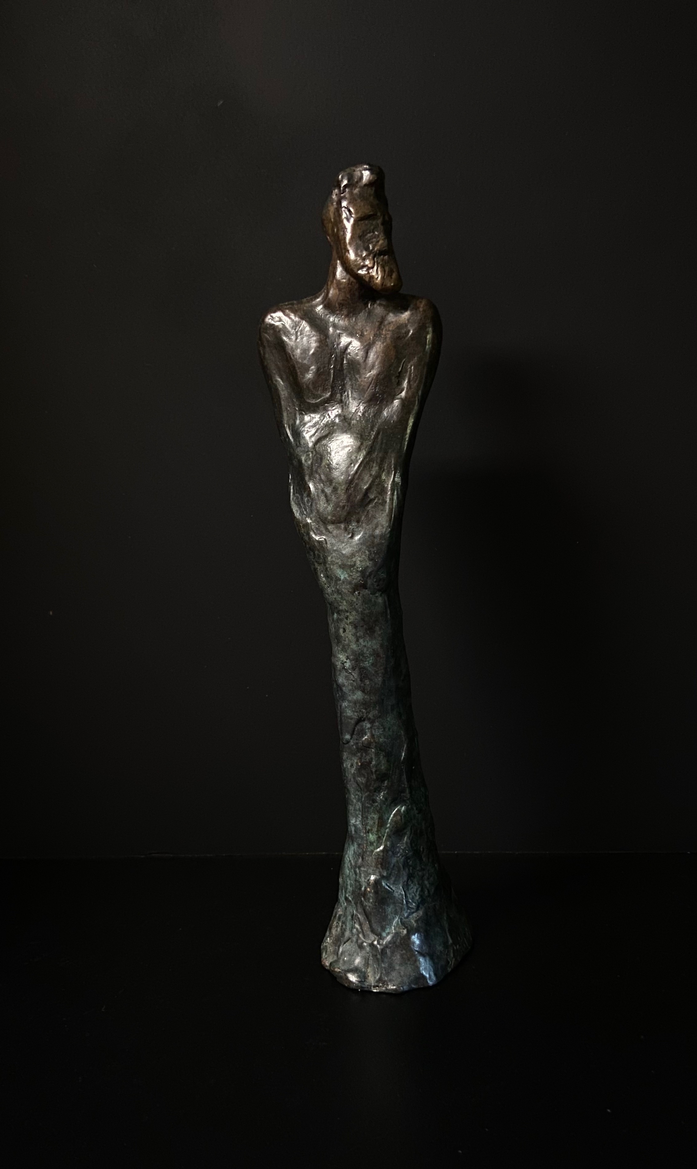 God of the Sea “Poseidon” the great earthquake maker. Posing, cool and calm with his hands at his side as if tucked in pockets and leaning back relaxed resembling the movement of a wave. “Poseidon” is a bronze sculpture standing 11” tall. An edition of 15. Created in 1999 during my time at The Bronzeworks Foundry.