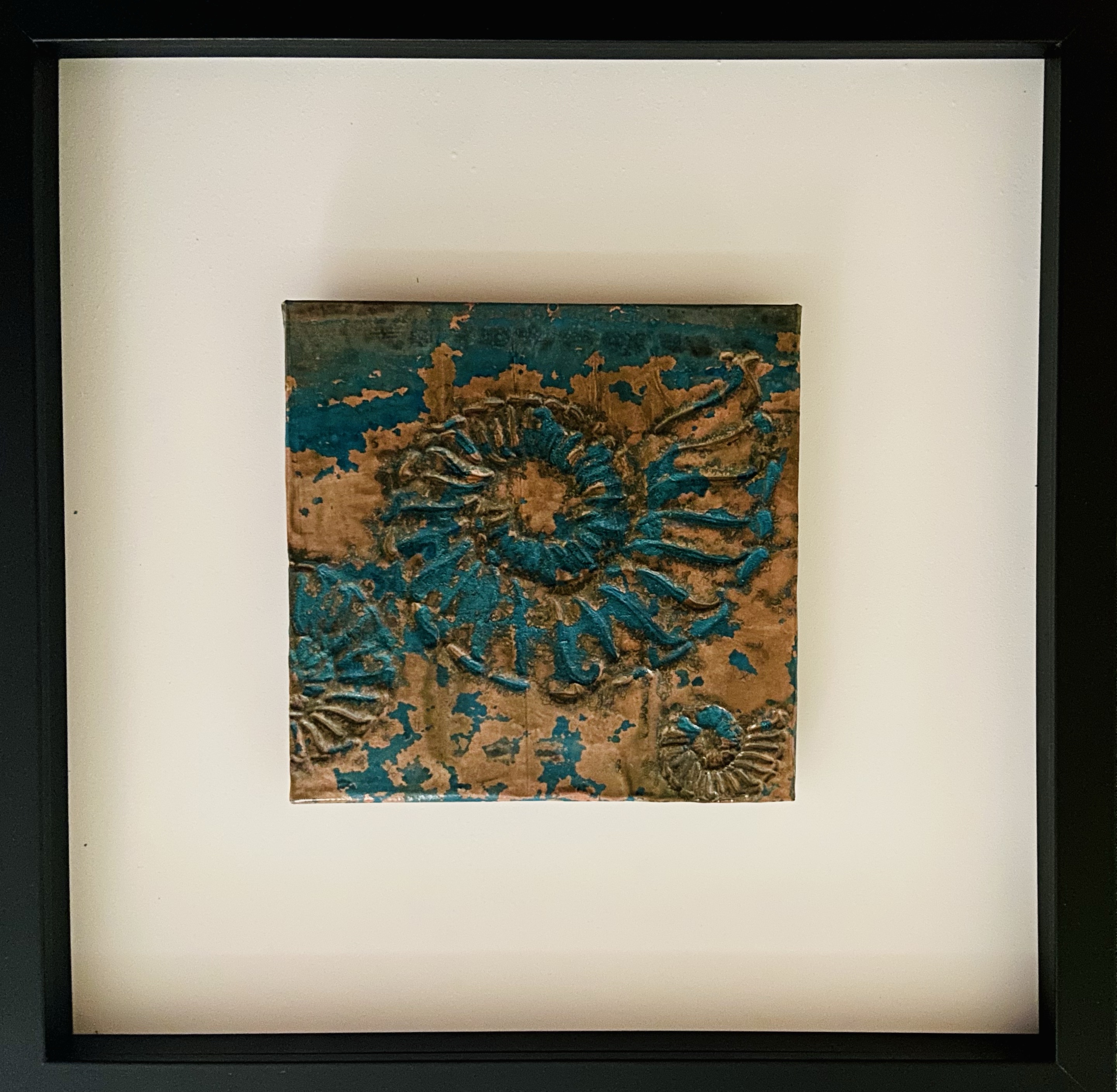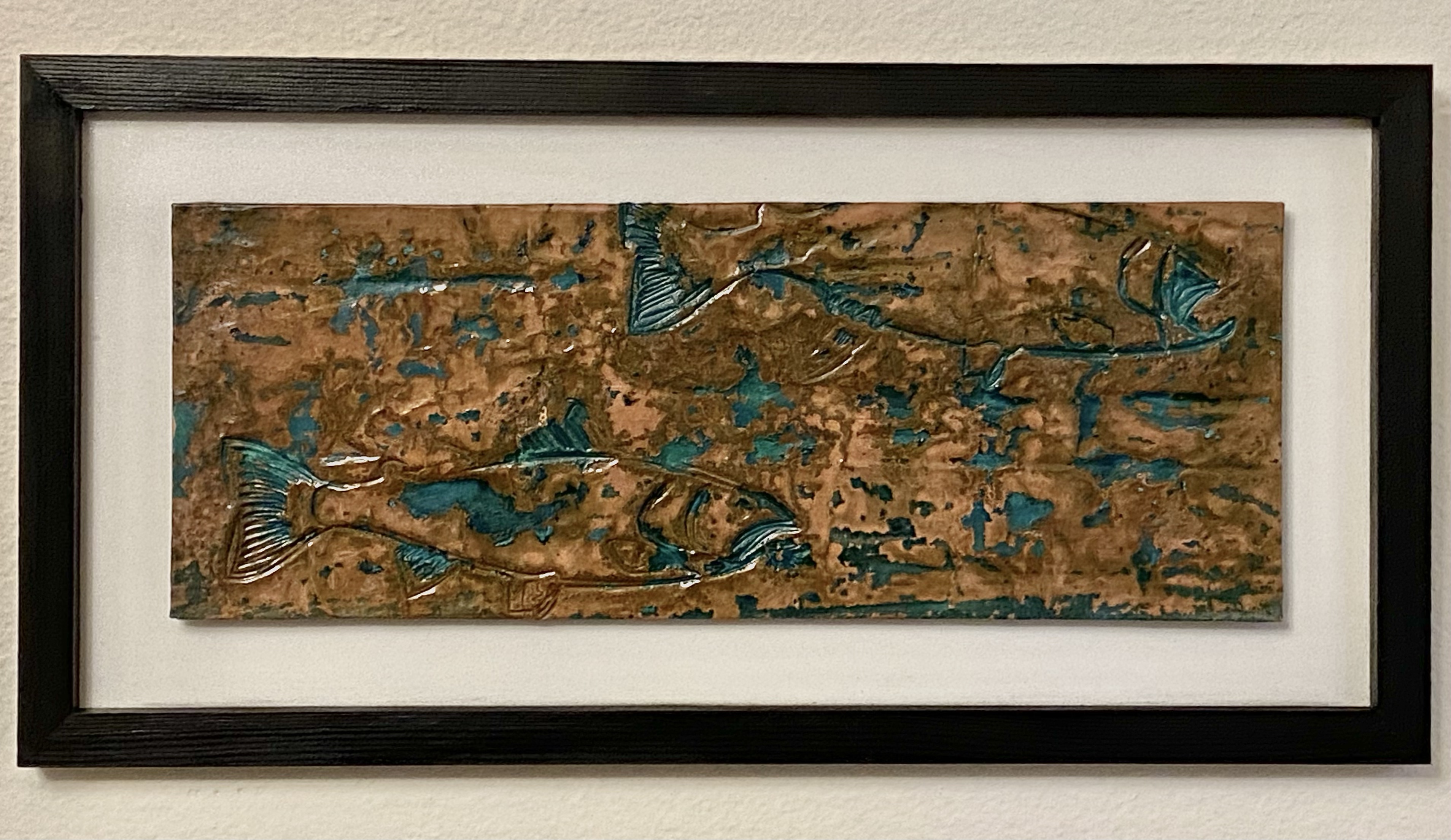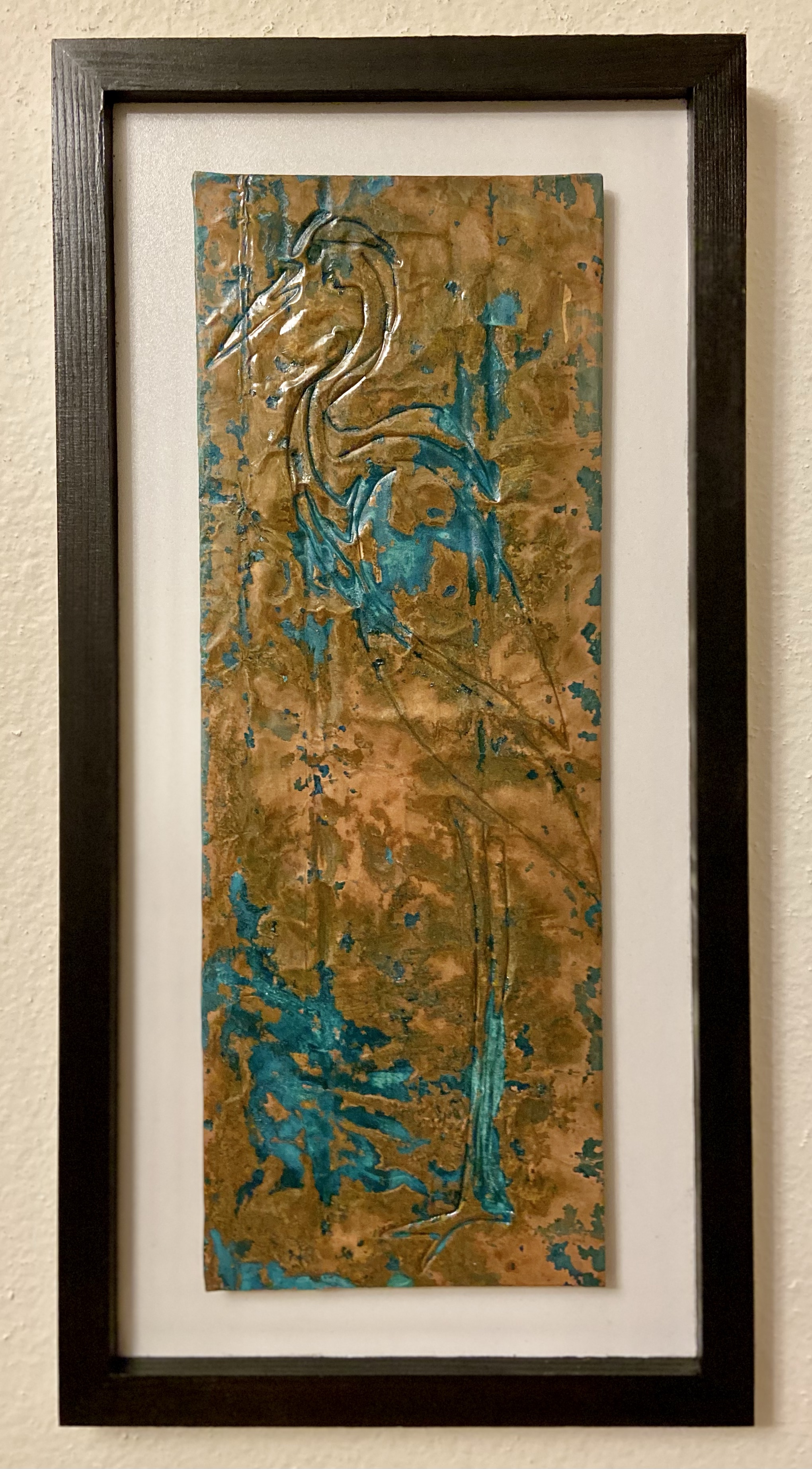 “Waters” is a series of 2 dimensional artworks created using luminescent copper that is patinated to create bright blue hues that resemble cool waters. Embossed with lines and texture that form familiar aquatic animals and mounted in box frames as if floating that adds depth and a 3 dimensional feel.