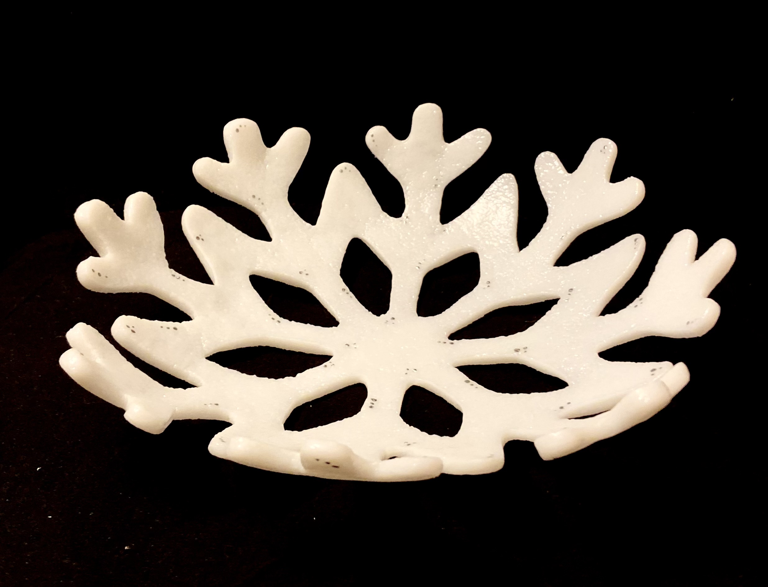 A delicate and textured pate de verre glass snowflake. Hand painted with silver enamel detail. Glass artwork measures 9.5″ in diameter by 2″ in height.