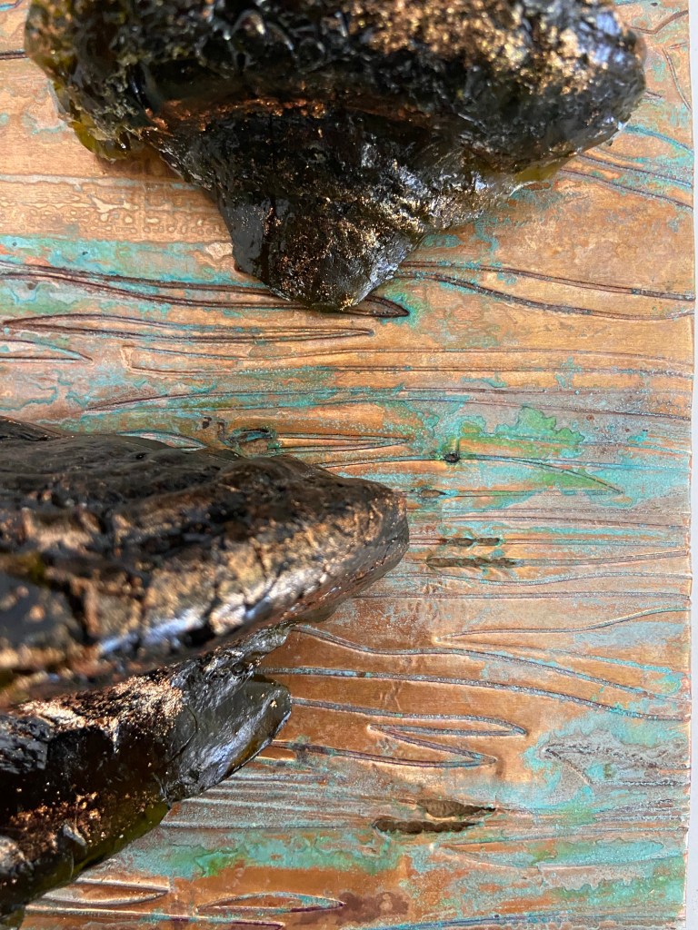 Cast glass and embossed copper with tree bark texture and green patina highlights.