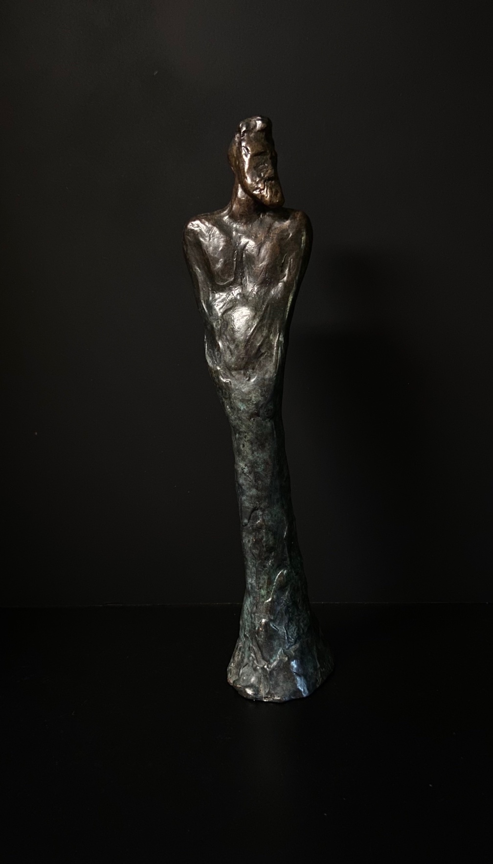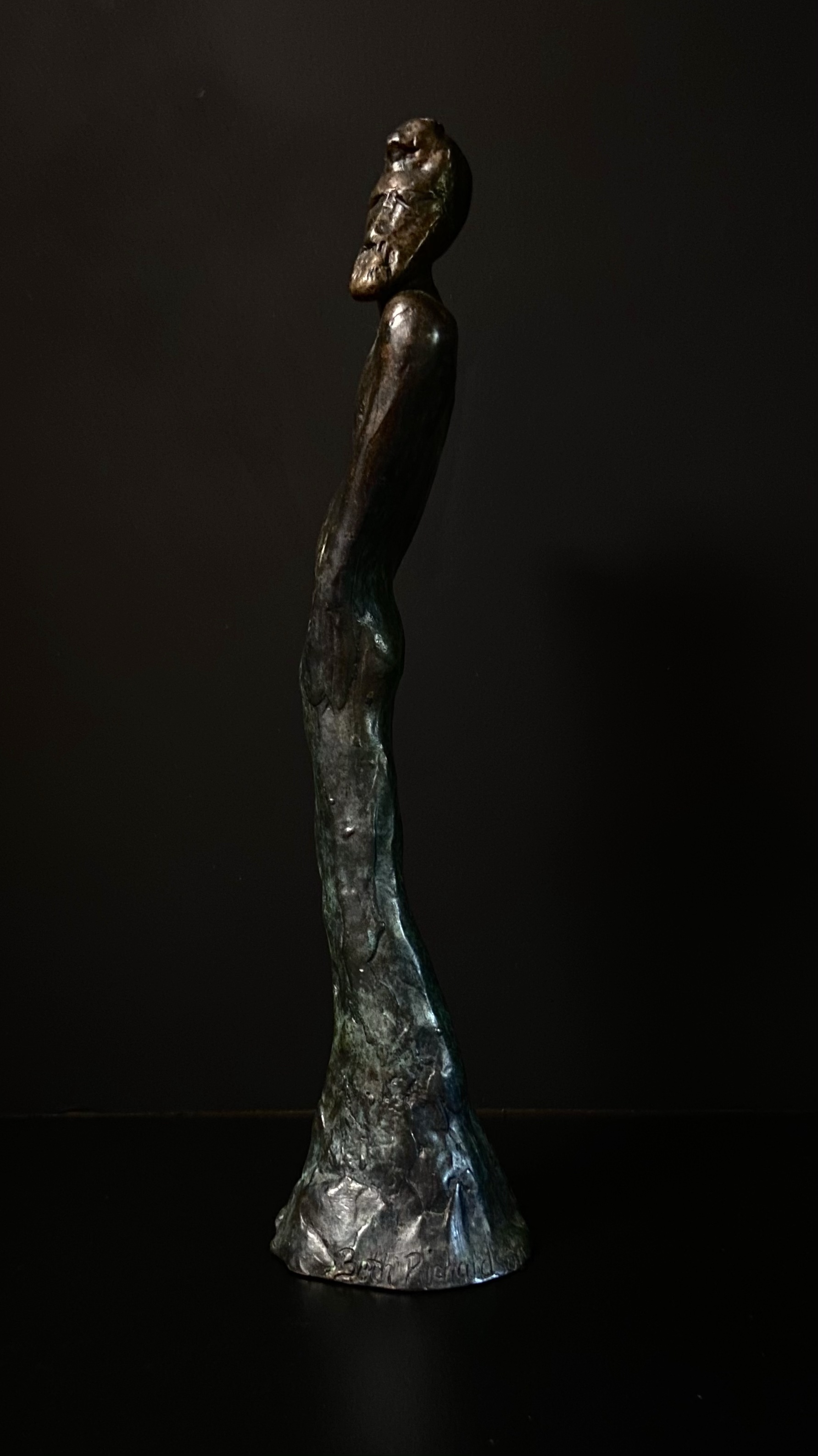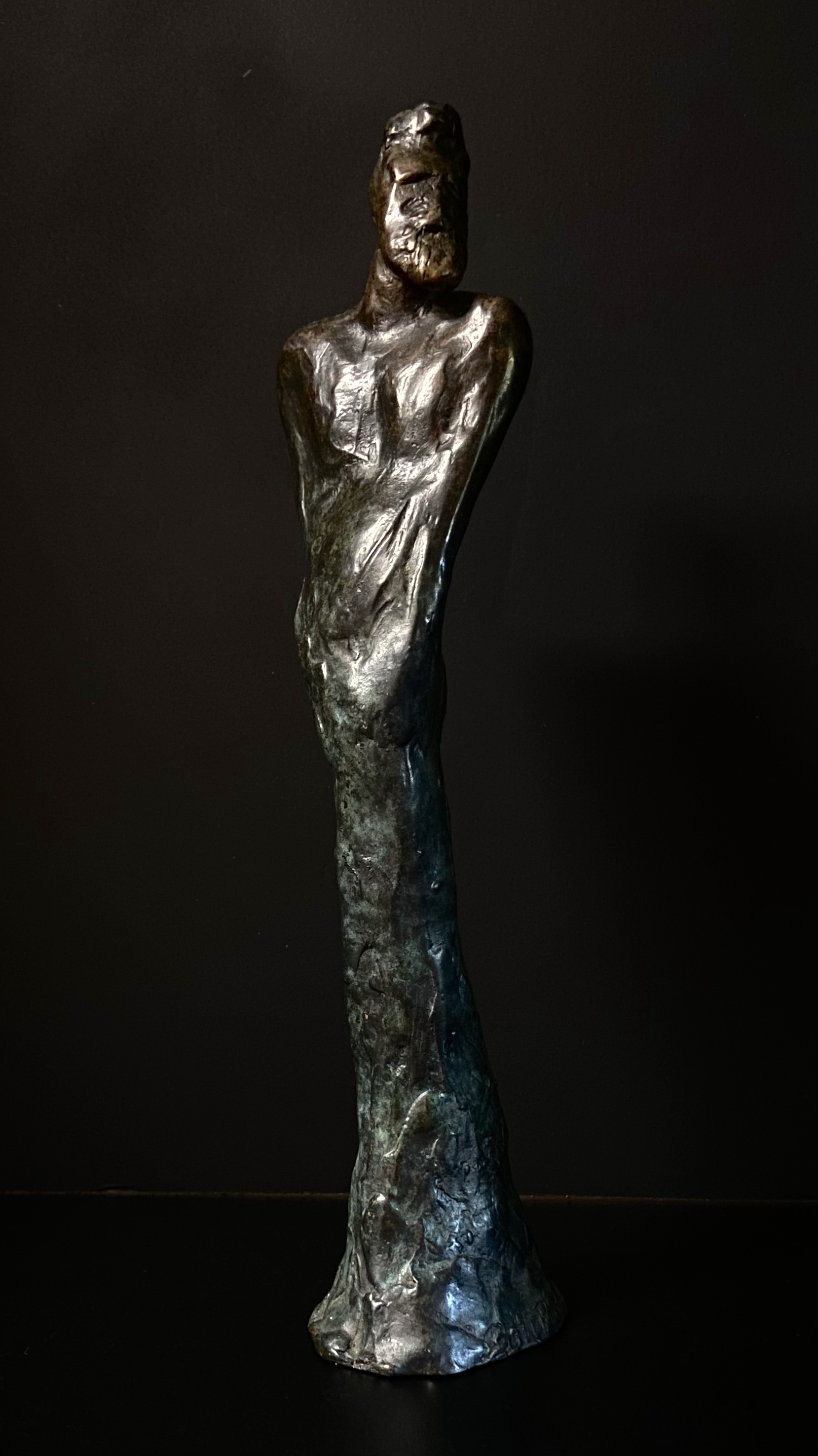 God of the Sea “Poseidon” the great earthquake maker. Posing, cool and calm with his hands at his side as if tucked in pockets and leaning back relaxed resembling the movement of a wave. “Poseidon” is a bronze sculpture standing 14” tall. An edition of 15. Created in 1999 during my time at The Bronzeworks Foundry.
